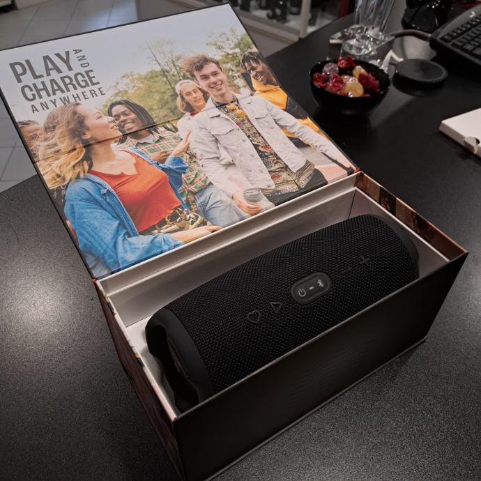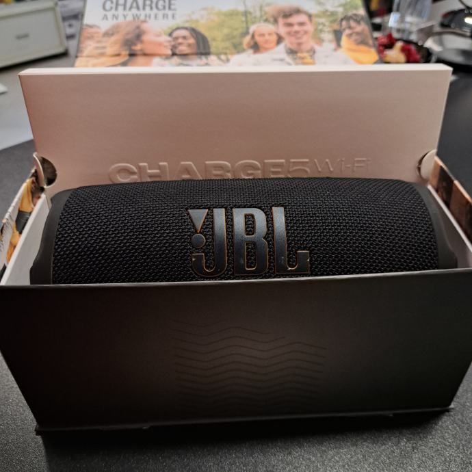 Kot nov,Prenosni zvočnik JBL Charge 5 WiFi je opremljen z brezžično tehnologijo Bluetooth 5.3 in brezžično povezavo WiFi s podporo za storitve AirPlay, Alexa Multi-Room Music, Chromecast in Spotify Connect. Z enim polnjenjem lahko predvaja do 20 ur, ima funkcijo powerbank ter je odporen na vodo in prah po standardu IP67. Skupna izhodna glasbena moč RMS je 40 W.