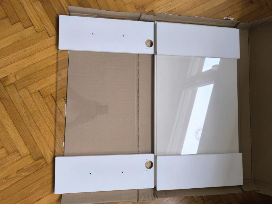 Vrata steklena dvojna, za zgornji element, širine 80 cm, višina 71 cm. Leseni del bela mat.
