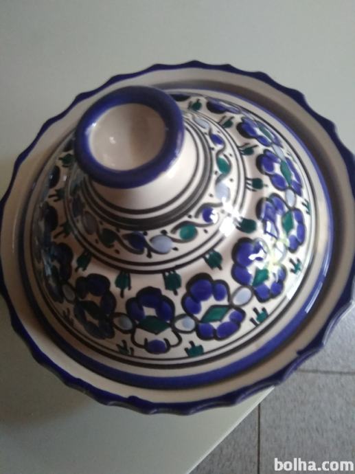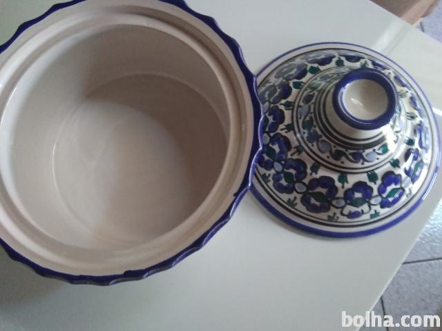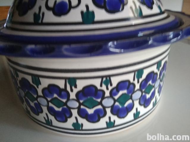 Keramična posoda ročna poslikava. Notranji premer 17 cm zunanji 22 cm, višina notranjega dela od DNA do roba brez pokrova 7.5 cm.