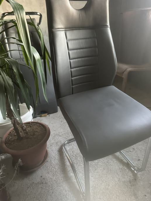 Prodam set štirih rabljenih stolov v modernem dizajnu. Stoli imajo kovinski kromiran okvir in sivo umetno usnje, ki je udobno in enostavno za čiščenje.