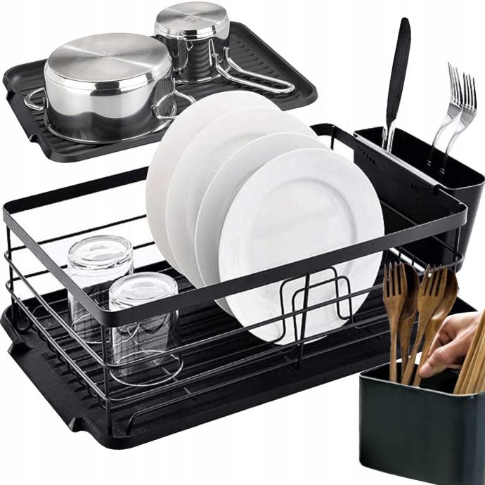 IZGLED – moderen, eleganten loft videz bo sušilni stroj okras vaše kuhinje! Komplet vsebuje odstranljiv odcejalnik za jedilni pribor – preprosto ga obesite na stranske prečke sušilnega stroja. Namestite ga lahko kamor koli na odcejalnik. Podnožje odcejalnika za jedilni pribor in glavno korito za vodo sta izdelana iz trpežne črne plastike. Poleg tega se univerzalna črna barva prilega vsaki notranjosti.