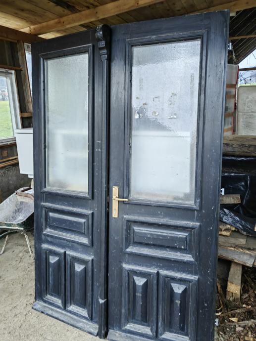 Starinska dvokrilna vhodna vrata, brez podboja, mere 220x150cm, macesen, cela in napoškodovana, steklo termopan, cena 70€