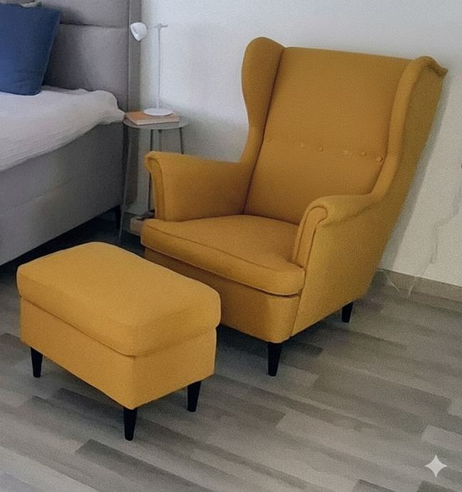 Prodam v kompletu fotelj + podnožnik v rumeni barvi, kupljeno pred 2 mesecema, v perfektnem stanju.