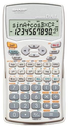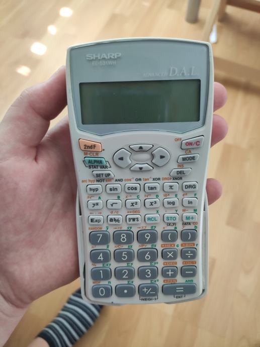 Kalkulator Sharp EL-531WH. Deluje odlično. Ima dvovrstični LCD zaslon, s katerim lahko poleg osnovnih računskih operacij izračunate še vrednosti kvadratnega korena, kotnih funkcij, odstotkov, potenc,...Dodatne funkcije: 272 matematičnih funkcij 9 spominov smerne tipke za pomik po formulah multi-line playback do 142 korakov računanje z ulomki, integrali eno in dvodimenzionalna statistika napredna direktna algebrična logika. Pred zunanjimi poškodbami, ga varuje čvrst drsni pokrovček.