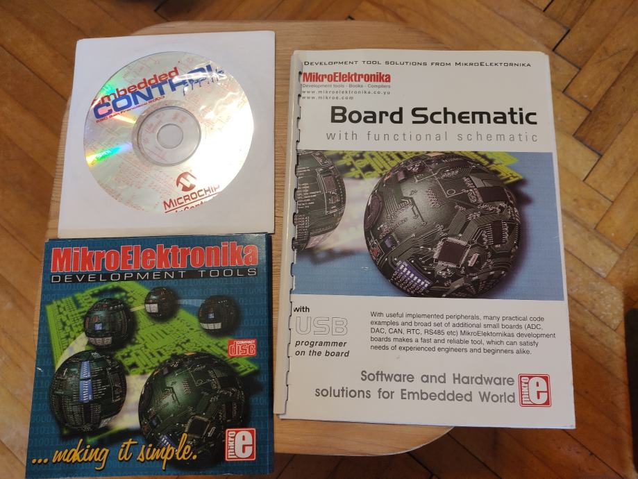 Razvojna plošča Easy PIC 2 za programiranje PIC čipov. Zraven spadajo: navodila, CD driverji, USB kabel in nekaj čipov.