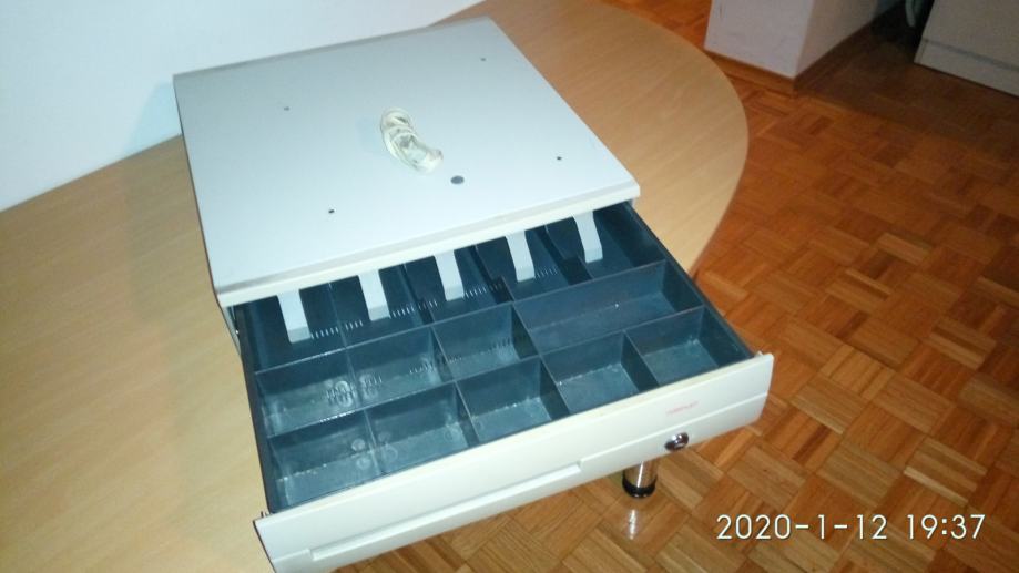 -blagajniški predal Posiflex brez ključa, odprt (v beli barvi) - 10 EUR.