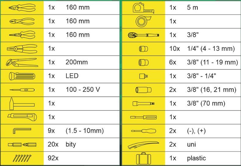 Set vsebuje ergonomske izvijače, imbus ključe, najpogostejše vrste klešč vključno s kladivom, LED svetilko, izvijač za nastavke vključno z 20 nastavki, meter 5 m dolžine, izolirni trak in drugo. Poleg tega je komplet opremljen z kovčkom z 92 kosi veznega materiala. Vsi dodatki so pregledno razporejeni v plastičnem prenosnem kovčku dimenzij 38 x 34 x 8 cm.