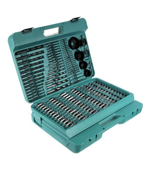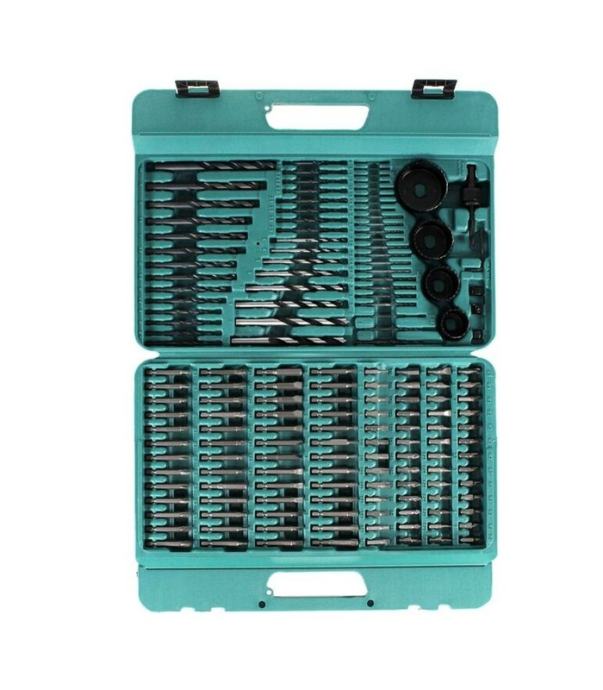Popoln komplet svedrov in nastavkov Makita P-44046 vključuje standardne in dolge serije ploščatih nastavkov in zidarskih nastavkov, torx, šesterokotne in kvadratne nastavke za izvijač, Phillips, Pozi in ploščate izvijače, merilni trak in vodno tehtnico