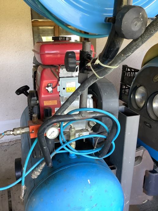 Malo rabljen bencinski kompresor z navijalno cevjo dolžine 100m in pnevmatskimi škarjami. Priložen nosilec za cev. Možnost montaže na traktor, delovni stroj ipd. Rabljeno 1 sezono. Za informacije pokliči 041 933 345.