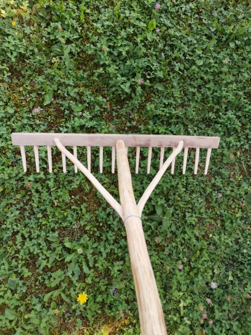 Lesene grablje več dimenzij, domače-ročne izdelava, ročaj in zobje grabelj sta izdelana iz leščevine, čeljust pa iz kostanja.