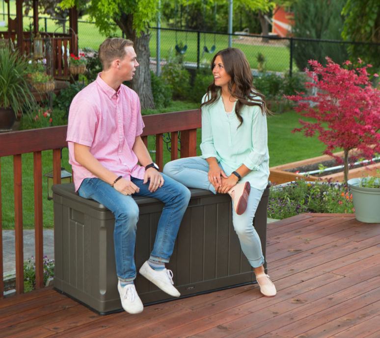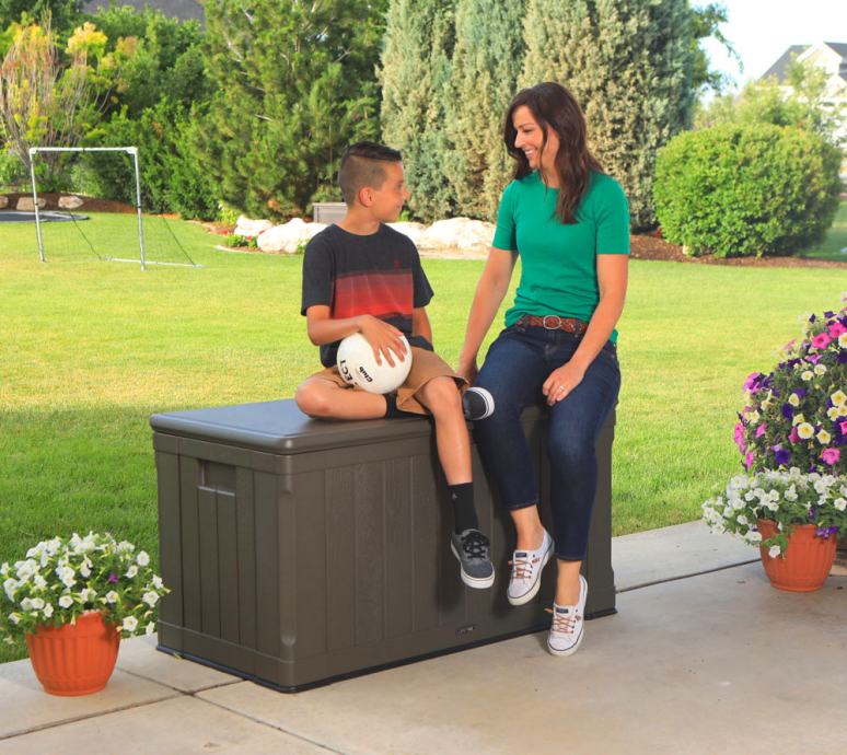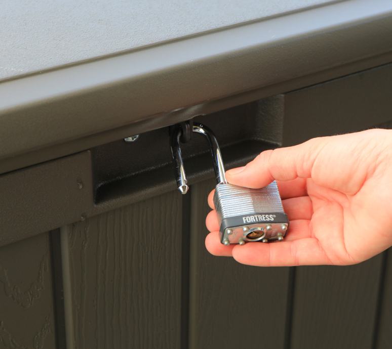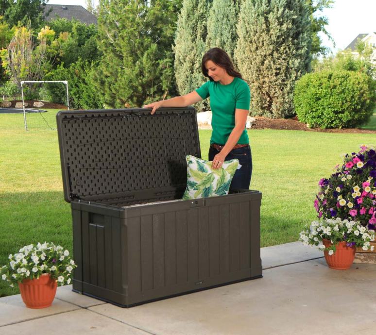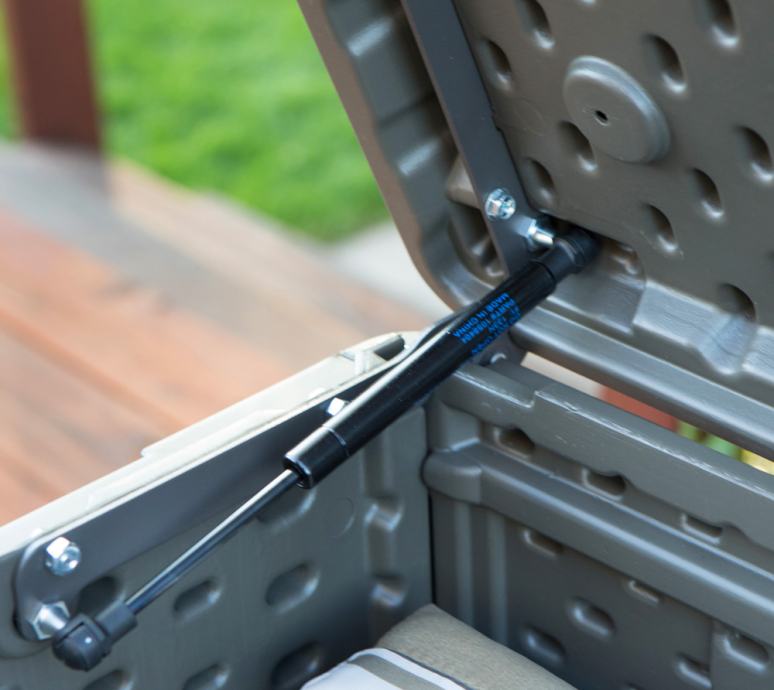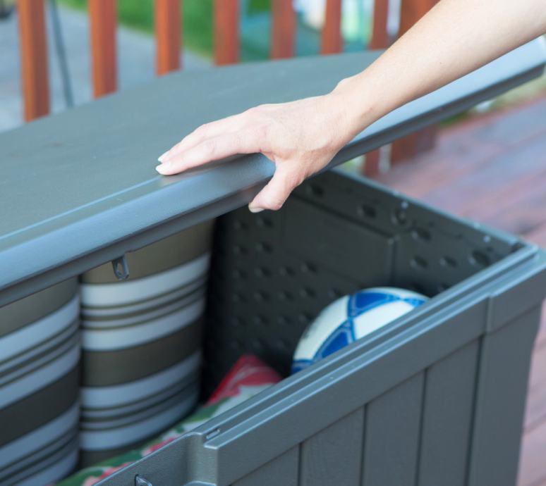Popoln tudi kot omarica in celo kot klop. Prostirnina cca 440l (namesto običajnih 300-400l). Blazine, vrtne posode, igrače, dodatki za bazen, ... so odlično shranjeni v zaboju, ki je primeren za uporabo na prostem vse leto. Vsebina je shranjena čista in suha. Nič ne more splesniti, umazati ali tvoriti plesni. Plinski tlačni dušilci držijo pokrov pokonci.