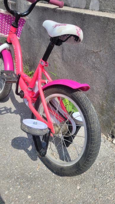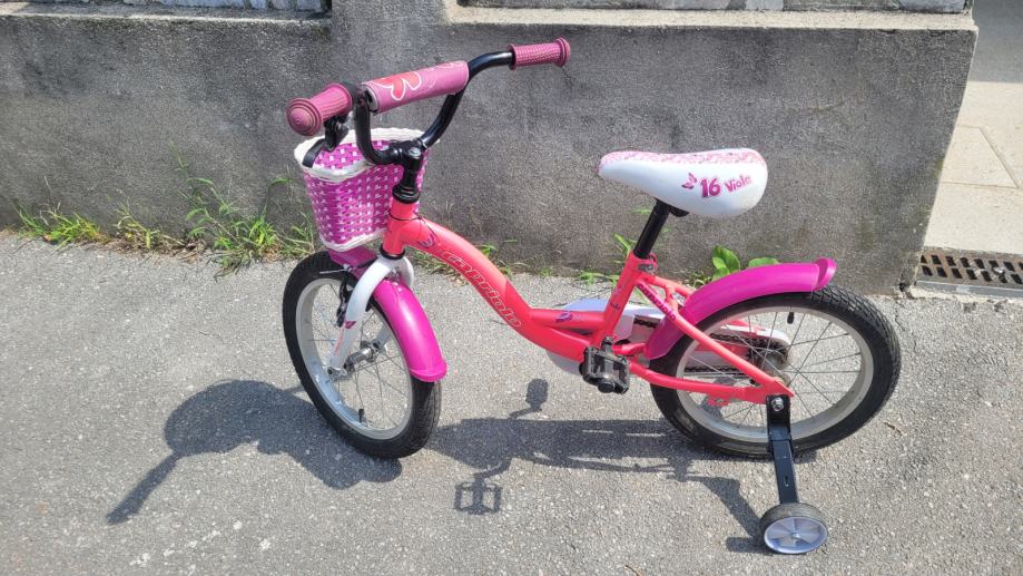 Otroško kolo Capriola 16 Viola. Premer koles je 16'', pomožna koleščka za varno vožnjo. Ima prednjo V-zavoro in zadnjo Coaster zavoro.