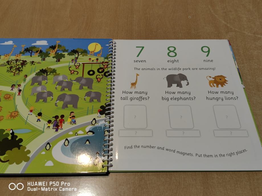 Ta knjiga za štetje z magneti je namenjena otrokom, starim 3 leta in več, in je namenjena delitvi staršev in otrok. Vsebuje pet barvitih prizorov, polnih predmetov, ki si jih lahko ogledate in o njih govorite. Preberite preprosto besedilo, nato poiščite in preštejte predmete v prizoru. Poiščite ujemajoče se magnete za številke in besede ter jih postavite v polja »odgovor«. Obstajajo tudi magneti za predmete za štetje in umeščanje. Magnetni deli se varno držijo strani in jih lahko znova in znova uporabljate za zgodnjo zabavo pri učenju. Napisala Susie Linn in ilustriral Dan Crisp
