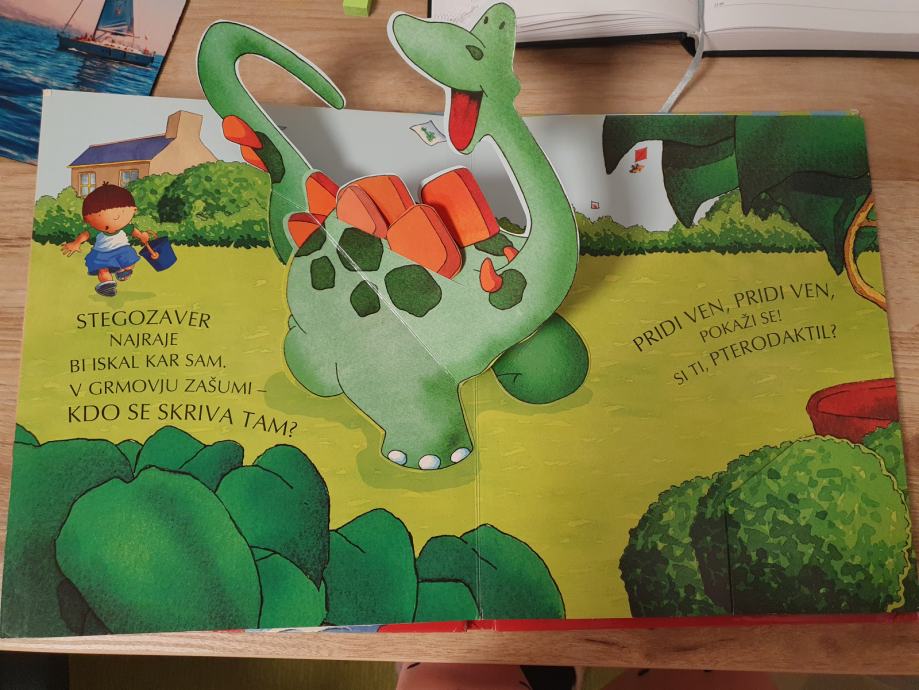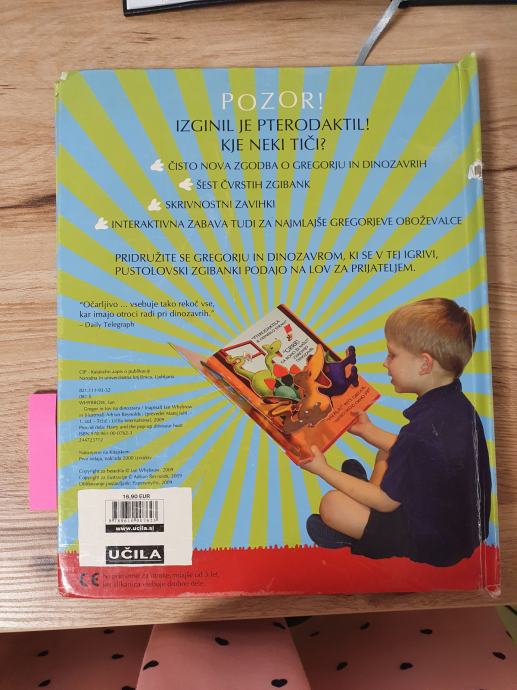 Prodam knjigo Gregor in lov na dinozavra, Založba Učila. Knjiga je primerna za mlajše otroke, saj se na vsaki strani, ki jo odpreš iz strani dvigne dinozaver. Žal je knjiga nekoliko poškodovana, zaradi otrok, vendar delujejo vsi dinozavri, razen enega, prav tako so vse strani čitljive in berljive.