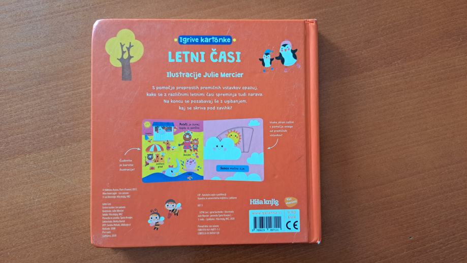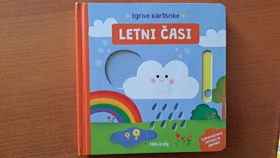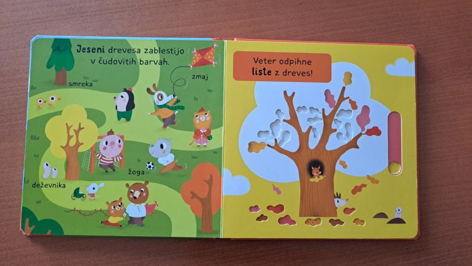 Odlično ohranjena kartonka, ki otrokom predstavi letne čase. Otroci s knjigo lažje povežejo dogajanje okolja z besedami in tako širijo svoj besedni zaklad. Knjiga vsebuje tudi pomične elemente.