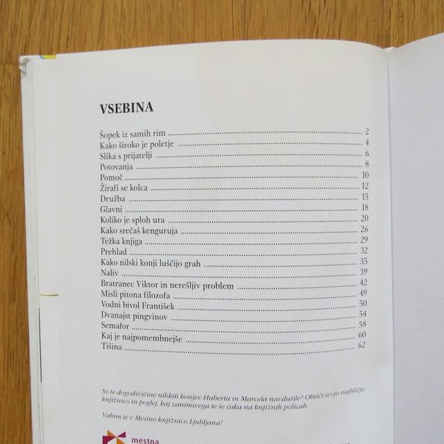 Prodam ODLIČNO ohranjeno knjigo z naslovom: MODROST NILSKIH KONJEV, avtor: Peter Svetina, vsebina: Nilska konja Hubert in Marcel rada sedita v senci pod platano in rada modrujeta, kako narediti šopek samih rim, kako široko je poletje, kakšna je najlepša slika...., 63 strani.