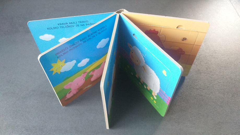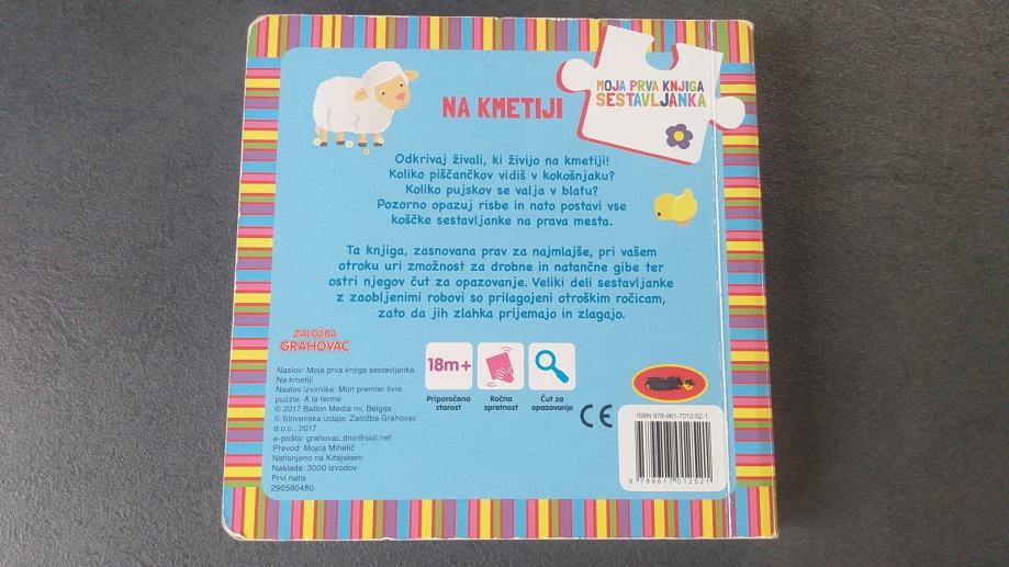 Odkrivaj živali, ki živijo na kmetiji. Koliko piščančkov vidiš v kokošnjaku? Koliko pujskov se valja v blatu? Pozorno opazuj risbe in nato postavi vse koščke sestavljanke na prava mesta. Ta knjiga, zasnovana prav za najmlajše, pri vašem otroku uri zmožnost za drobne in natančne gibe ter ostri čut za opazovanje. Veliki deli sestavljanke z zaobljenimi robovi so prilagojeni otroškim ročicam, zato da jih zlahka prijemajo in zlagajo.