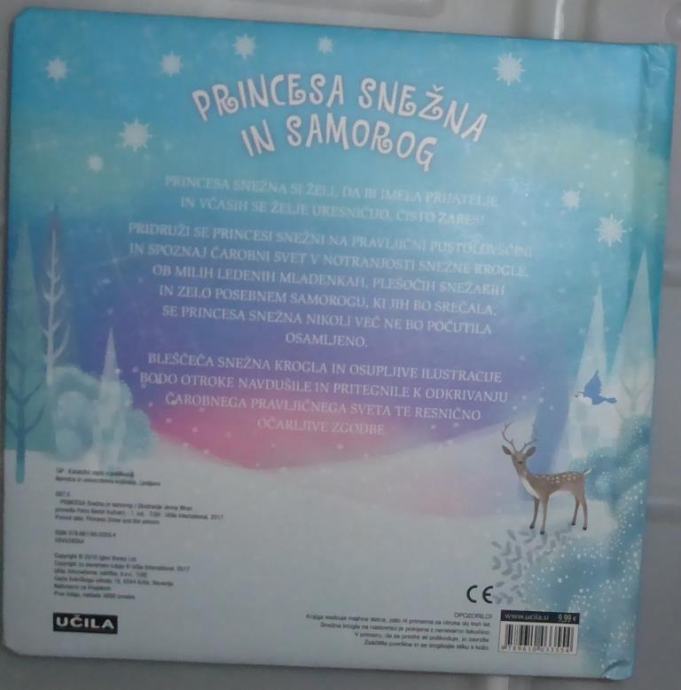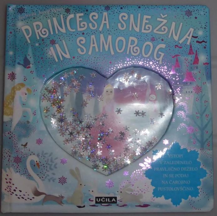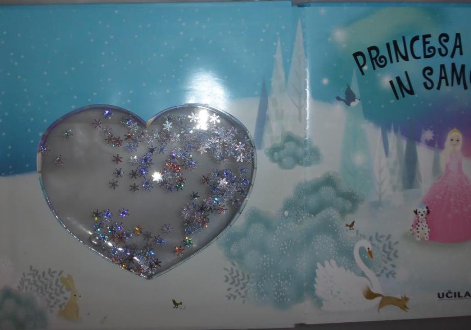 Čudovita, posebna knjiga. "Snežinke" se premikajo po tekočini v srčku.