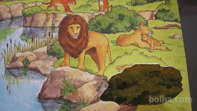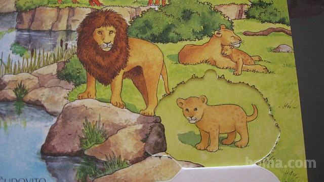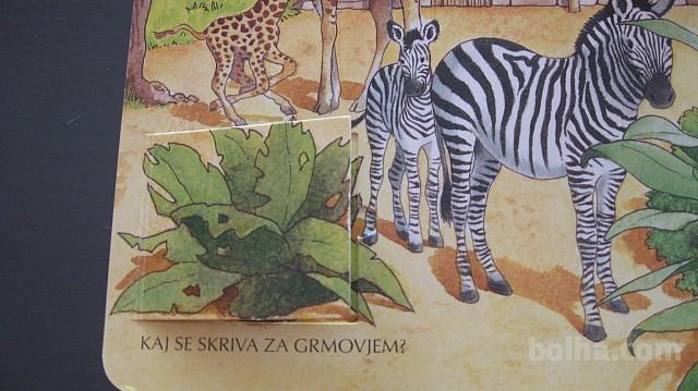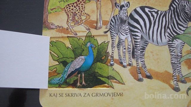 Kartonka z zavihki in dvema okencema, poučna - otroci bodo izvedeli katere živali živijo v gozdu, katere v vodi in spoznali še veliko drugih zanimivih živali