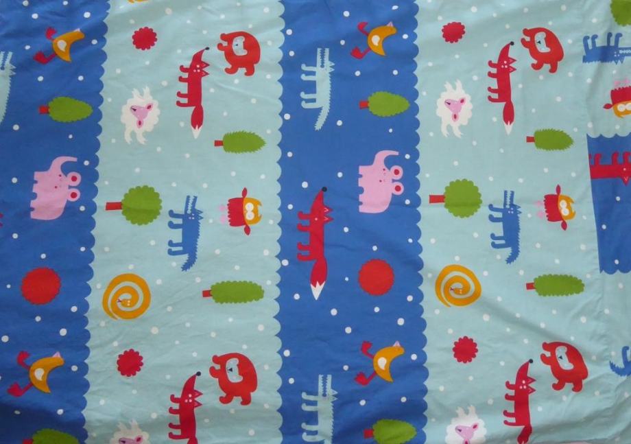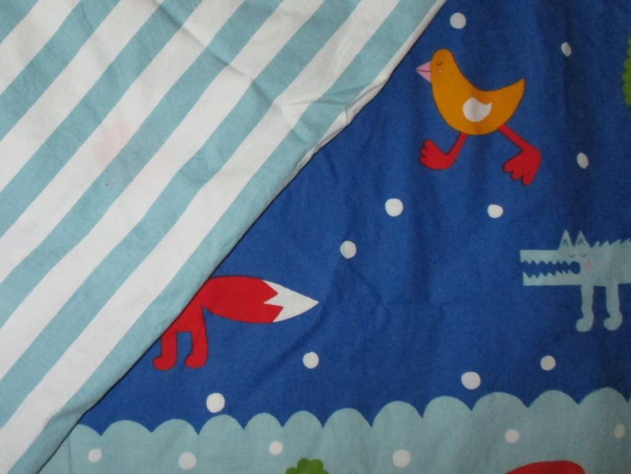 Bombažna, modra, obojestranska: na eni strani črte, na drugi pisani živali.