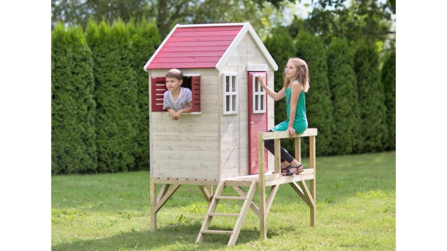 Varnost je izjemno pomembna, zato je ta igralna hišica izdelana iz vrhunskega naravnega smrekovega lesa s certificirano vodno osnovo barve. Varna uporaba je zagotovljena z visokokakovostno izdelavo in zaobljenimi robovi. Priporočljivo je enkrat letno ponovno barvanje, da se ohrani kakovost.