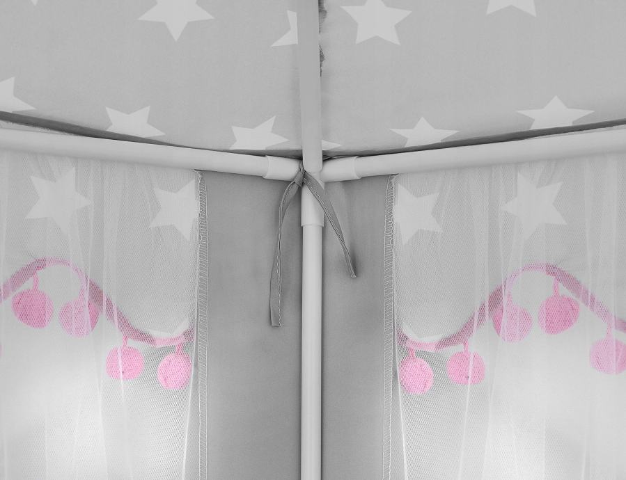 NOV, IZBOLJŠAN MODEL – ustvarili smo popolnoma nov, izboljšan model šotora. Uporabili smo kombinacijo roza in sive barve z motivom zvezdice. Poleg tega so na volančkih čudoviti čopki, ki jo naredijo še bolj privlačno. Šotor ima 6 vhodnih lukenj in stožčasto streho. Vse skupaj izgleda fantastično in se bo odlično podalo v vsak prostor .