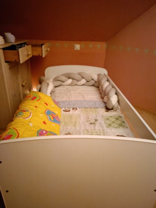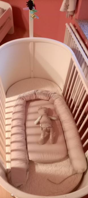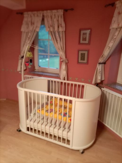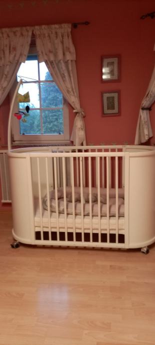 Nastavljiv po višini, ograja se lahko odstrani in priredi v posteljico. Ima nastavek za baldahin in baldahin, Jogi je kot nov očiščen v kemični cistilnici.