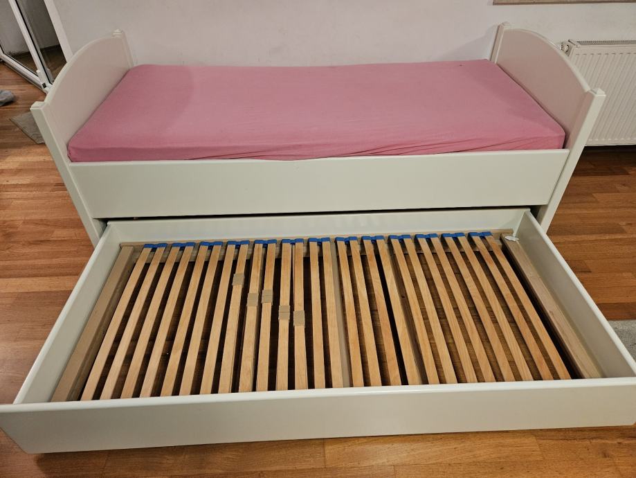 Otroška izvlečna postelja: 2x 200x90cm z latoflexi in vzmetnicama. Zunanja velikost 210×97×85cm. Bele barve, dobro ohranjena.