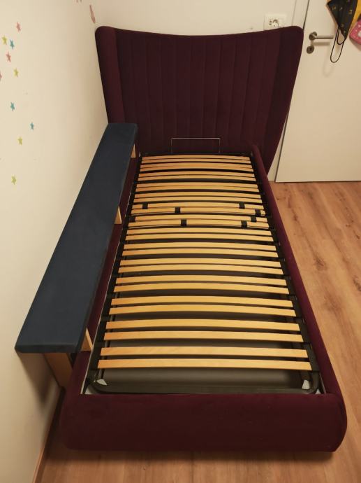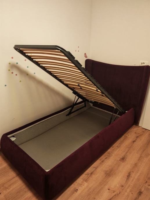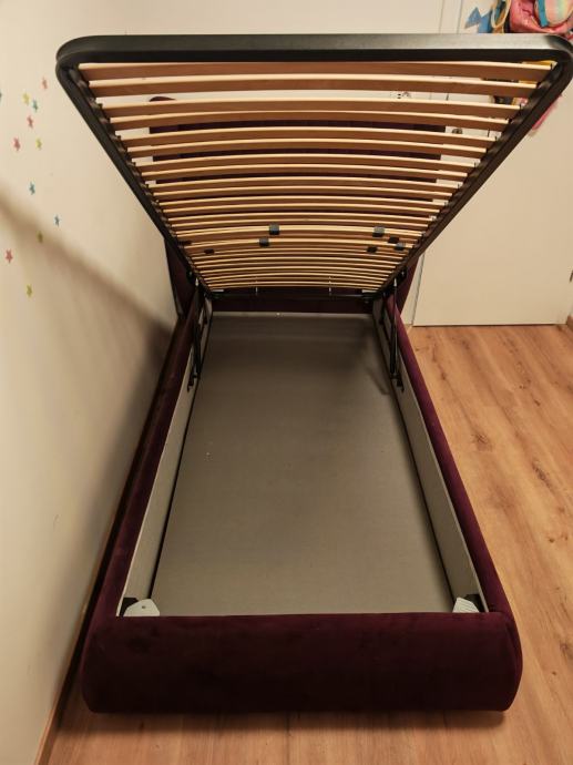 Postelja je vijolične barve in je cela oblazinjena. Pod dvižnim dnom je uporaben prostor za shranjevanje.