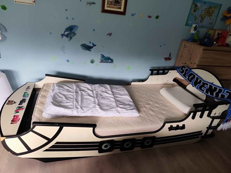Atraktivna otroška postelja v obliki gusarske ladje, komplet z letvenim dnom, velikosti 90x200 cm.