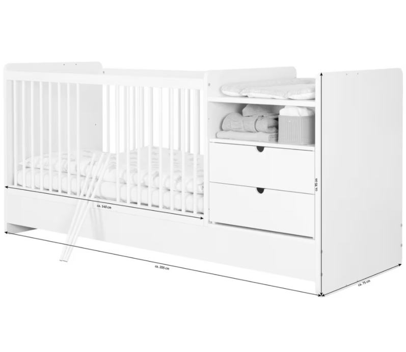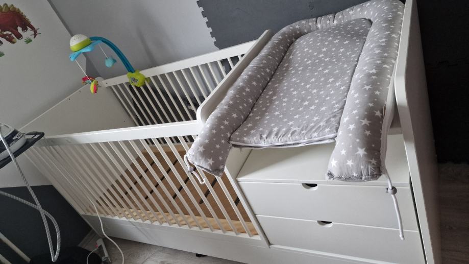 Prodam otroško posteljico v beli barvi. Posteljica ima vgrajene predale za shranjevanje, kar omogoča dodatni prostor za otroške stvari. Ob posteljici je še priložena previjalna površina. Posteljica je opremljena z lesenimi letvami za ležišče in varnostnimi ograjami. Dimenzije ležišča so 70x140 cm, dodam tudi vzmetnico