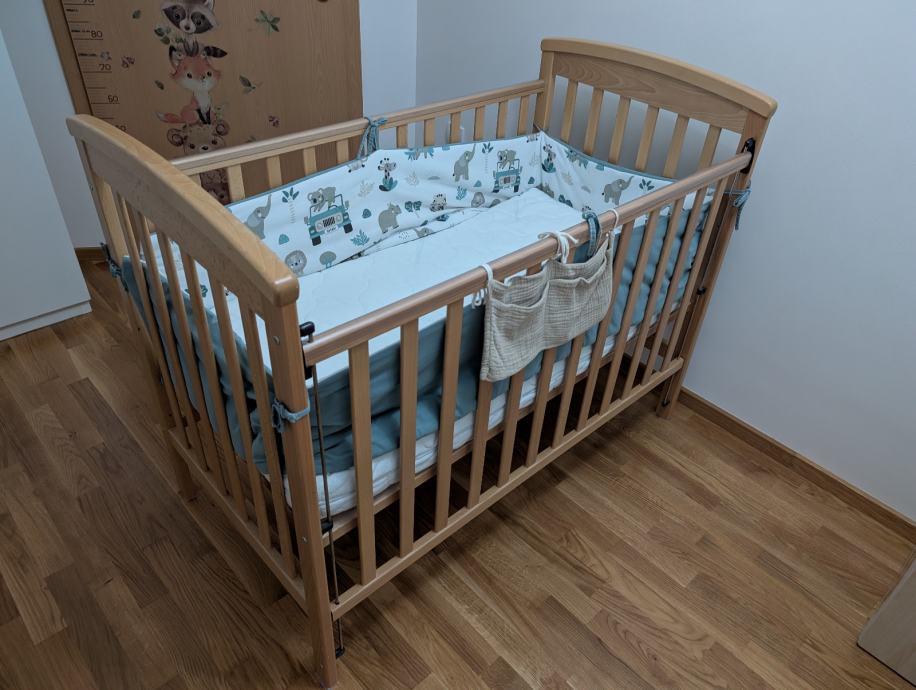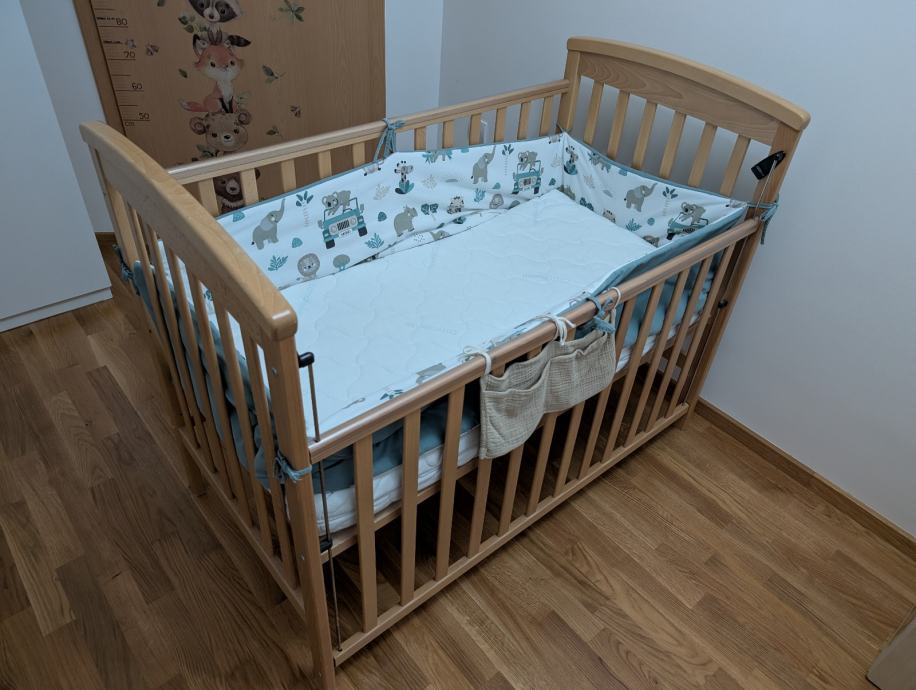 Zraven dodamo vzmetnico 120x60 s snemljivo pralno prevleko (višina vzmetnice 13 cm). Prav tako dodamo oblogo posteljice (vetrc) in stranski shranjevalni žep.