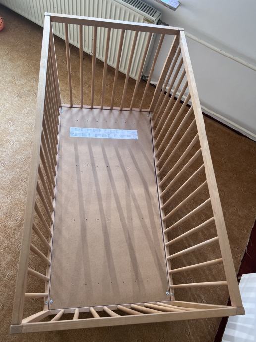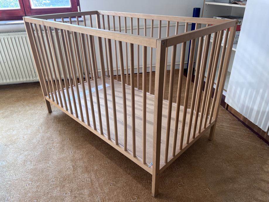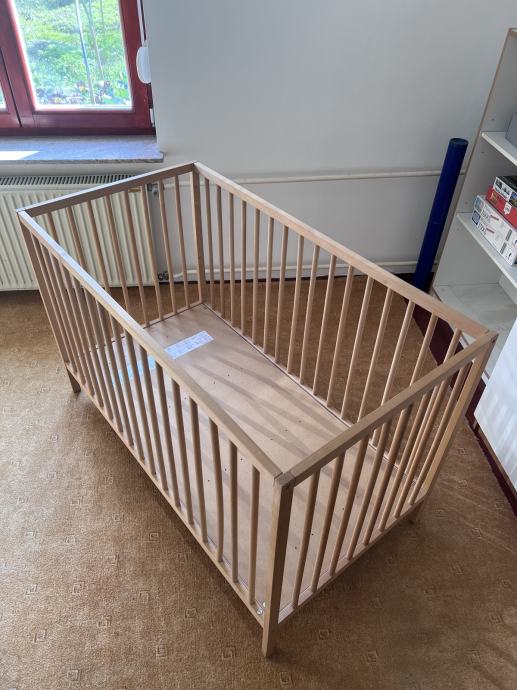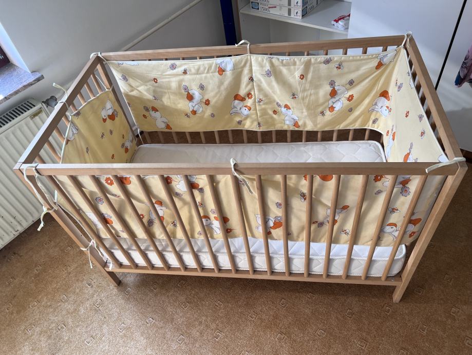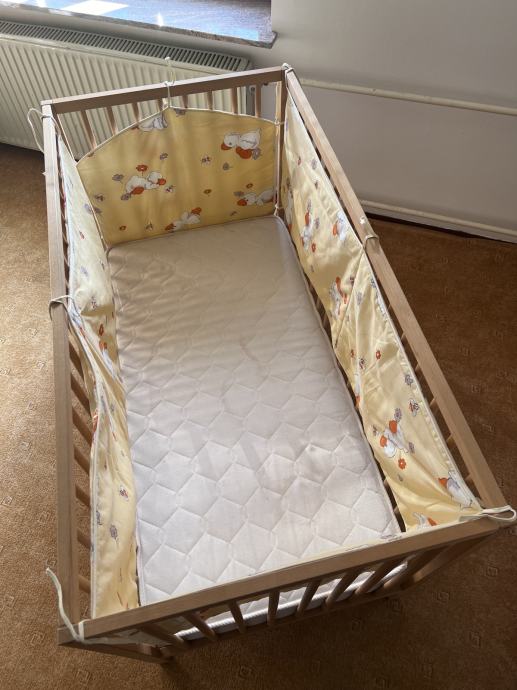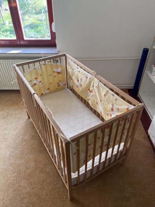 Otroška posteljica dimenzij 120 x 60 cm, nastavljiva višina ležišča. Priložen posteljni vložek višine 12 cm, posteljnina.