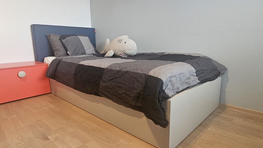 Prodam otrosko posteljo dim. 90x200 cm z letvenim delom in jogijem. Okvir je v svetli sivi barvi, naslon iz umetnega usnja.