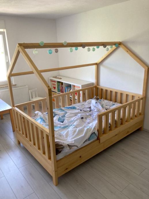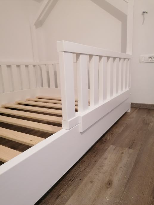 Postelja je izdelana iz masivnega lesa debeline 4cm tako da je res masivna ter kakovostna. Ograjica na sprednjem delu je snemljiva.