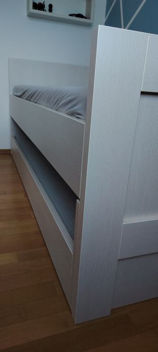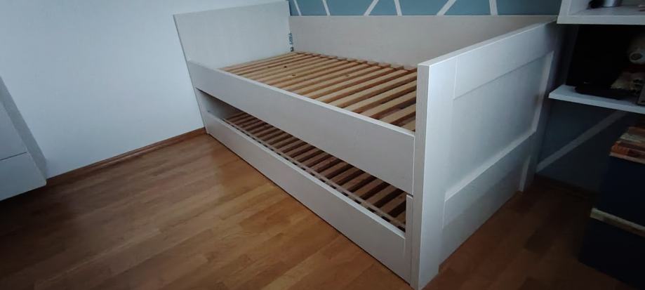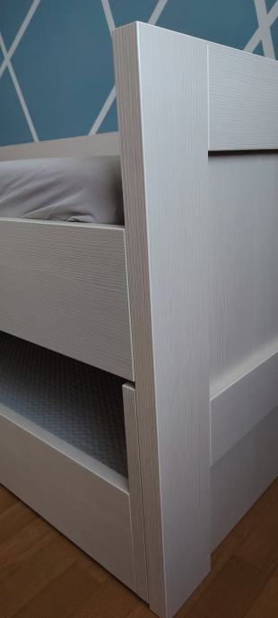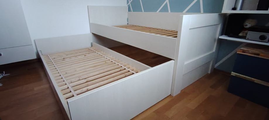 Prodam nekaj mesecev staro, rabljeno otroško posteljo z dodatnim izvlečnim ležiščem .primerna tudi za odrasli osebi. Postelja je odlična rešitev za majhne prostore, saj omogoča dodatno ležišče za obiske ali prespanje prijateljev. Leseni letvičasti pod zagotavlja dobro podporo za vzmetnico in udoben spanec. Postelja je močne izdelave, narejena po naročilu pri mizarju. Vzmetnici morajo biti dimenzije 200x90 cm.