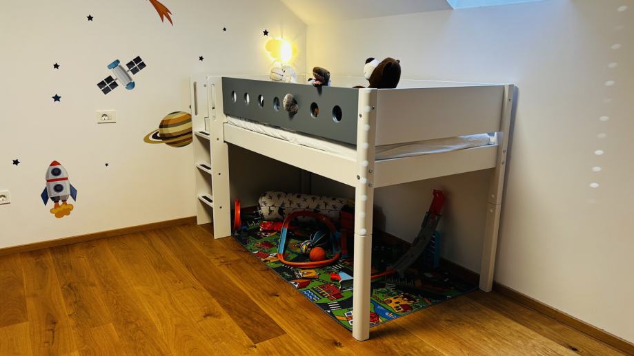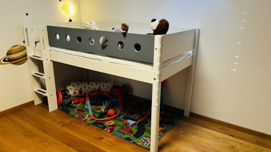 Prodam kakovostno in zelo lepo ohranjeno otroško posteljo Flexa White – polvisok model, primeren za otroke od cca 6 let dalje. Postelja je v celoti iz masivnega lesa, z varnostno ograjo in nedrsečo lestvijo.
