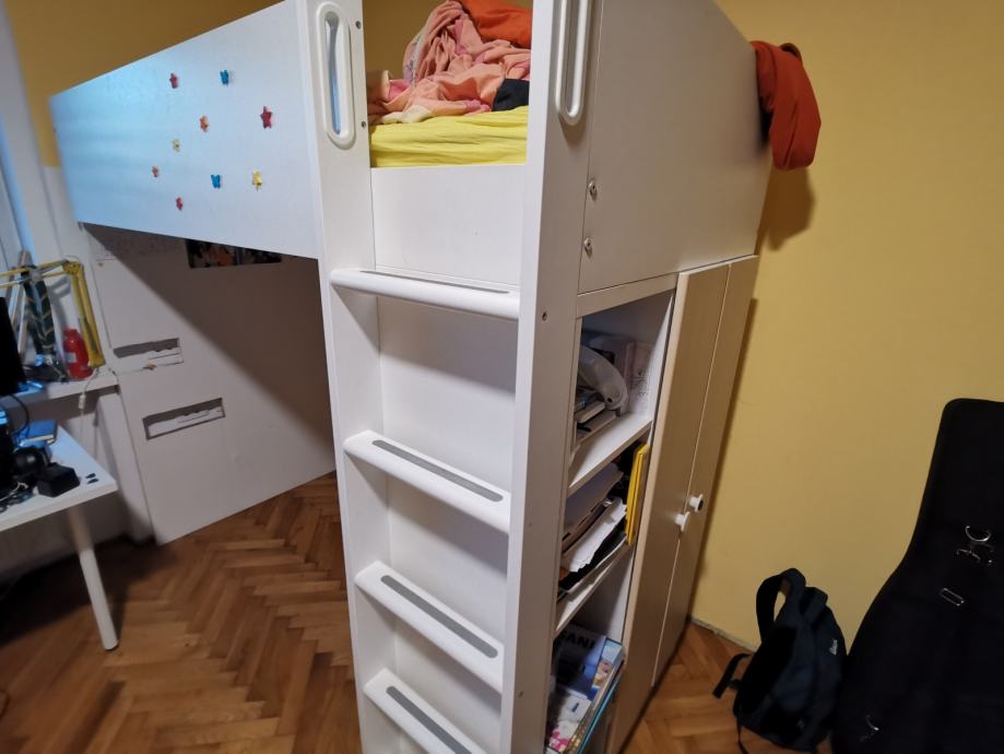 Prodam visoko posteljo Stuvia. Kupljena v Ikei. Postelja je srednje ohranjena in ima na stranici izrez zaradi vtičnic. Stabilnost ni ogrožena... Prodaja se brez pisalne mize.
