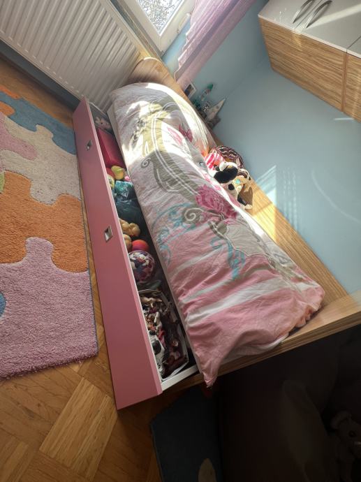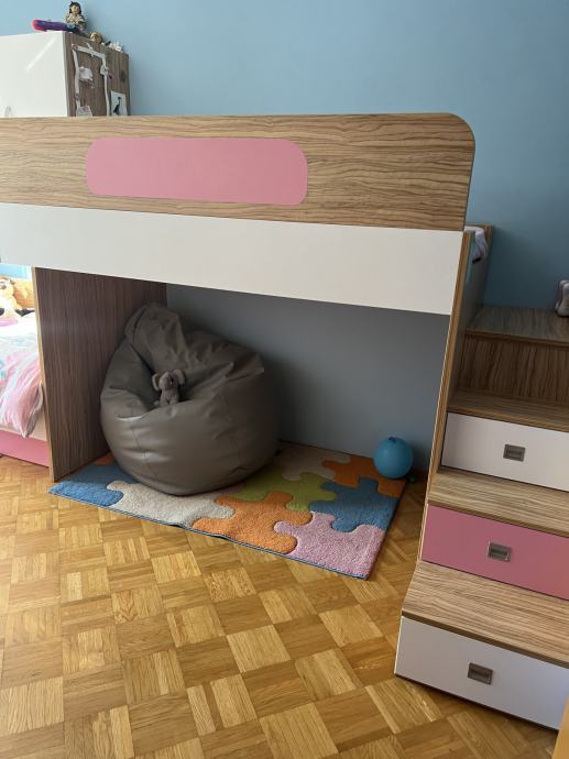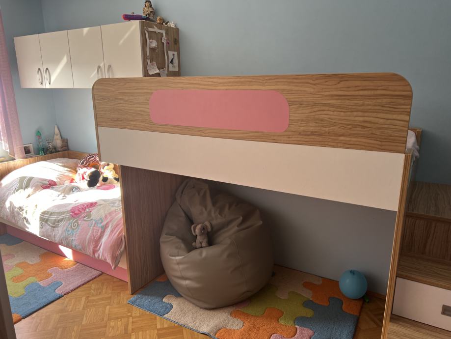 Prodam odlično ohranjeno in funkcionalno otroško sobico. Gre za zelo kvalitetno pohištvo, narejeno pri mizarju iz debelejše iverke (18 mm) v modernih barvah: oljka, bela in dekor v roza barvi, ki pa ga lahko za fantke po želji spremenite v modro. Komplet zajema posteljo 90X200 z ortopedskim in antialergijskim jogijem. Pod posteljo se po celotni dolžini nahaja predal za shranjevanje, ki je na kolesih za najlažji možen izvlek. Druga postelja je visoka, enakih dimenzij in ima tudi antialergijski, odlično ohranjen jogi. Do te postelje se dostopa po stranskih stopničkah, ki pa so hkrati tudi predalčki. Pod posteljo se nahaja igralni kotiček, ki ima tudi poličnik za knjigice ali igračke. Komplet vsebuje še dve prostorni omari za montažo nad posteljo. Dodamo še pisalno mizo s 5 predali. Nad pisalno mizo sta v istih dimenzijah na voljo še dve dvižni omarici. Sobica je res kvalitetno narejena in odlično ohranjena. Za vse ostale informacije:041 236 573