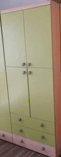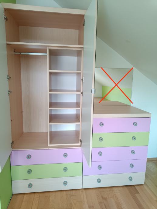Omara ima dodaten vložek s policami in narejena so bila dvo krilna vrata z ogledalom, da je dobila mladinski izgled. Originalna vrata so bila 2 x dvo krilna (1x roza 1x zelena) in 2 široki polici. Vse originalne dele priložimo. Zadnja slika je simbolična za prikaz originalnega izgleda omare.