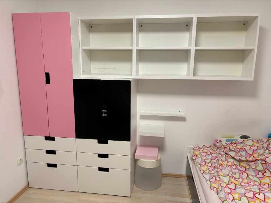 Prodam rabljeno otroško sobo s kombinacijo omare, predalnikov in odprtih polic v belo-roza-črni barvni kombinaciji. Komplet vključuje visoko omaro z roza vrati, črne predalčnike in bele odprte police za shranjevanje. Pohištvo je v dobrem stanju in primerno za ureditev funkcionalne otroške sobe. 1x Omara visoka, 1x nizka , 3x police, 1x predalnik. V kompletu. Omara velika 193x60x51, mala 129x60x51, Police 64x60x30, Predalnik 90x51x49.