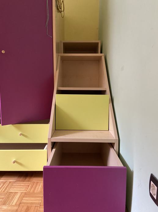 Zaradi selitve prodajamo odlično ohranjen komplet otroške sobe. Komplet vključuje 2 ležišča velikosti 190x90, ki sta v dveh nivojih. Povezana sta s stopnicami, ki služijo tudi kot dodatni predalniki. Komplet ima tudi eno večjo omaro (s predalnikoma in sistemom za obešanje). Nad spodnjo posteljo je še ena dodatna omarica s poličkami, pod posteljo pa dva predalnika. D 340cm, V 220cm, Š 110cm. Prevzem je možen v Lj.