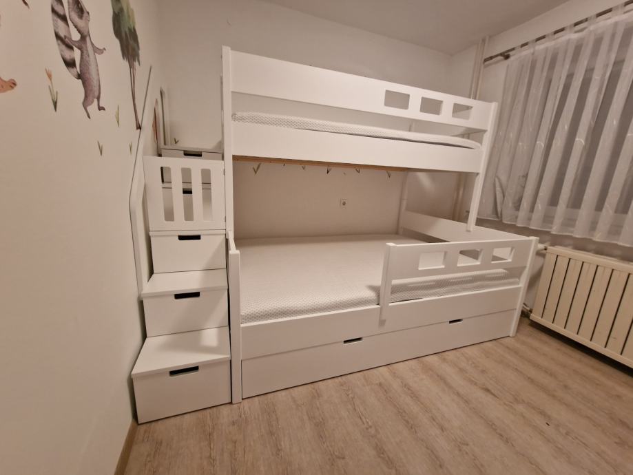 Nadstropna postelja. Stabilna, močna konstrukcija, spojena z mozniki za dolgoletno uporabo. Belo pokrivno lakirano, soft robovi.