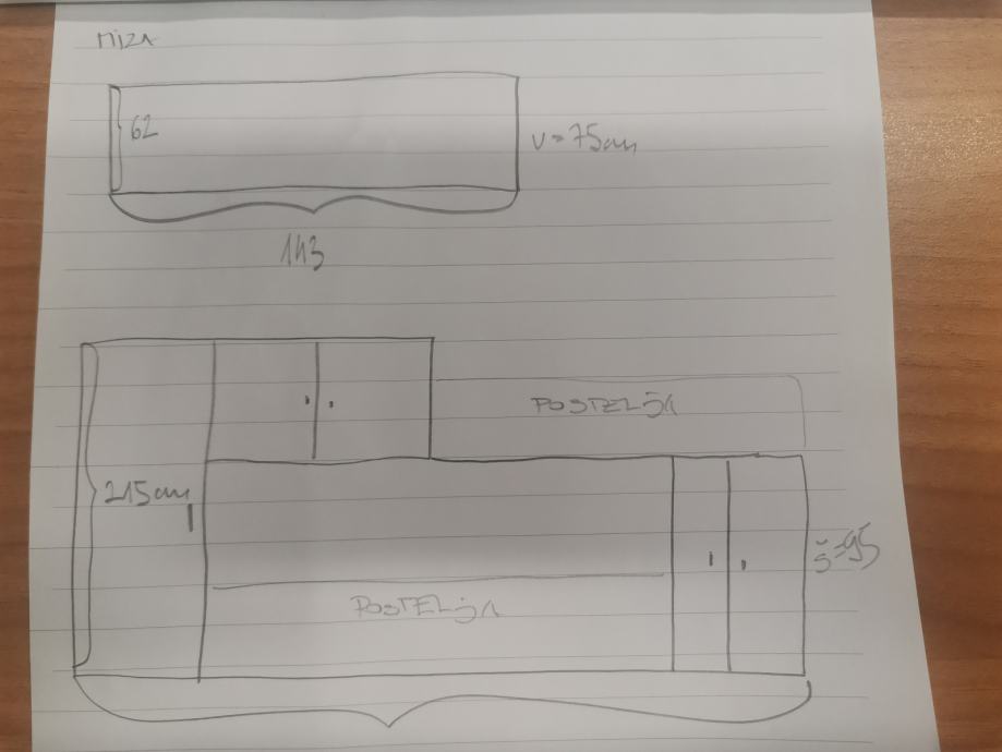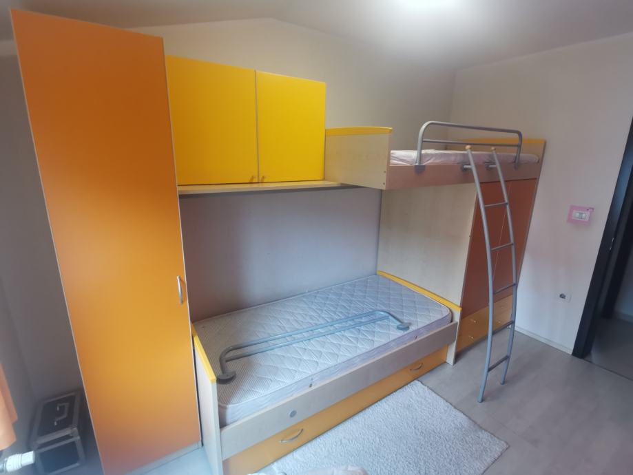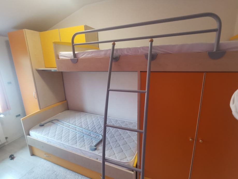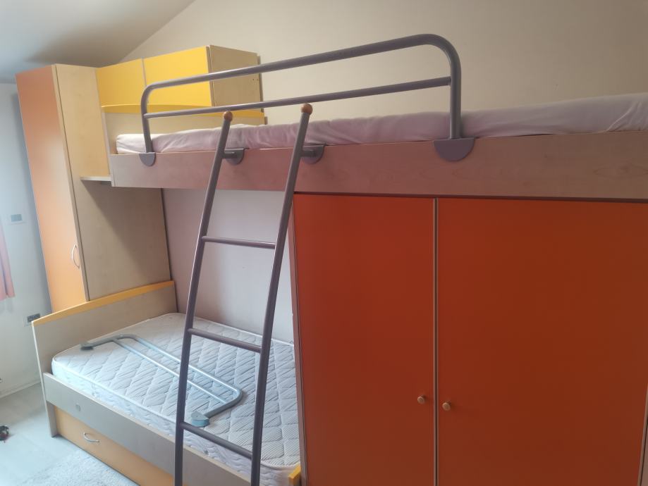 2x postelja pograd, 2x omara z obešalniki + 2 velika predala 1x dvokrilna manjša omara s policami.