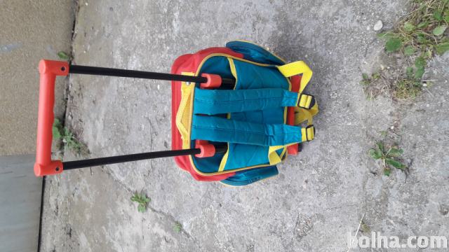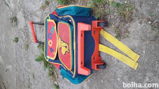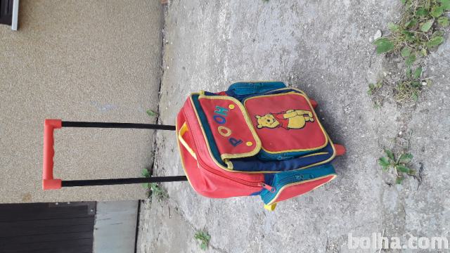 Nahrbtnik na kolesih Winnie the Pooh živopisanih barv ima veliko predalov za spravljanje.