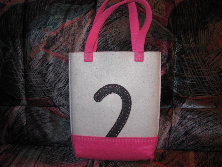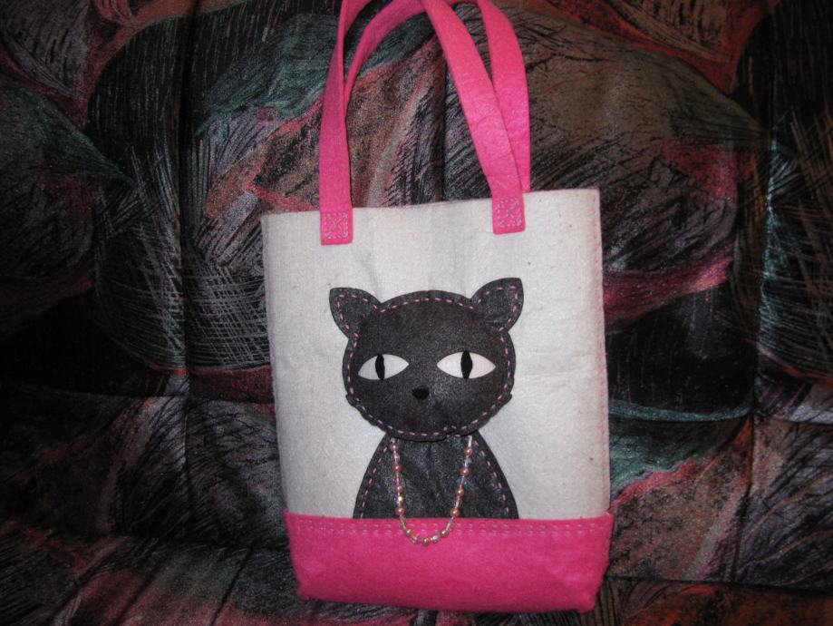 Lepa otroška torbica iz filca, ročno izdelana iz filca, roza-sivo-bela, spredaj 3D motiv muce z ogrlico, zadaj repek, 28 x 33 x 5 cm, lepo ohranjena. Samo osebni prevzem!