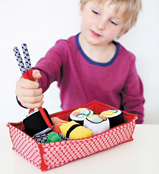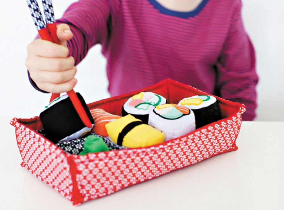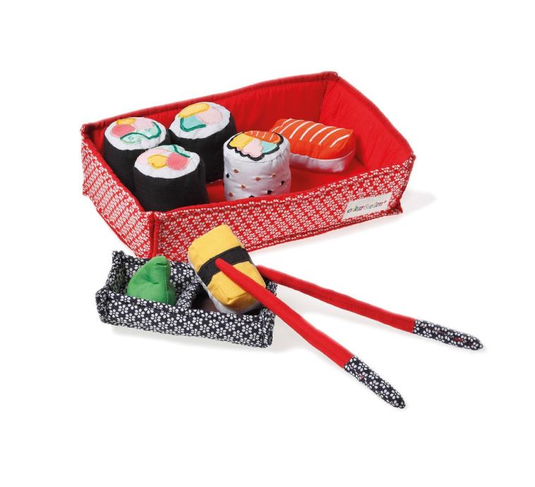 Igrajmo se Sushi bar! Eleganten in moderen igralni set je zabaven način za spoznavanje tradicionalne japonske kulture in kulinarike ter uporabo palčk. Primerno za igro vlog doma ali v vrtcu. Spodbuja otroško domišljijo. Vsebuje pladenj s sušijem, šest različnih sušijev, palčke in pladenj za namakanje v sojino omako in Wasabi. Skupaj 10 kosov.