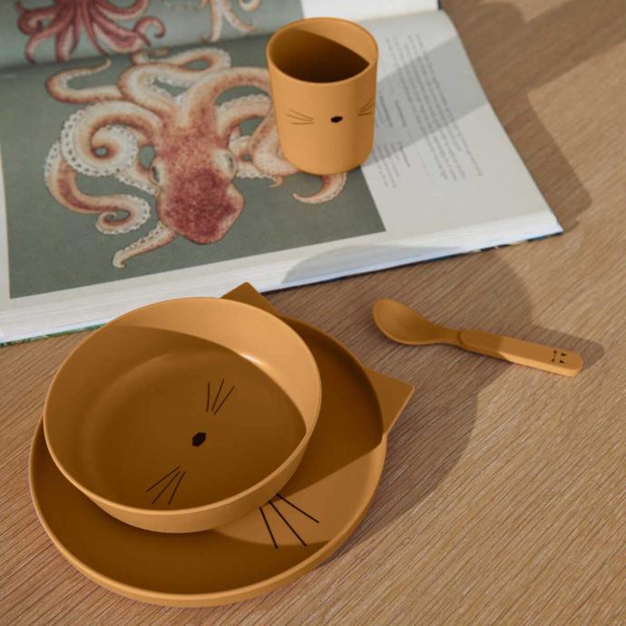 s prikupnim motivom mucka je idealen za uporabo pri vseh obrokih in drugih prigrizkih ter vsebuje: plitev krožnik, skledico, kozarček ter jedilni primor žlico.