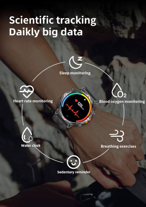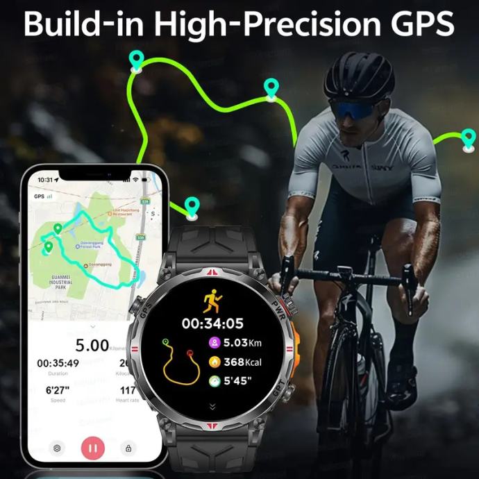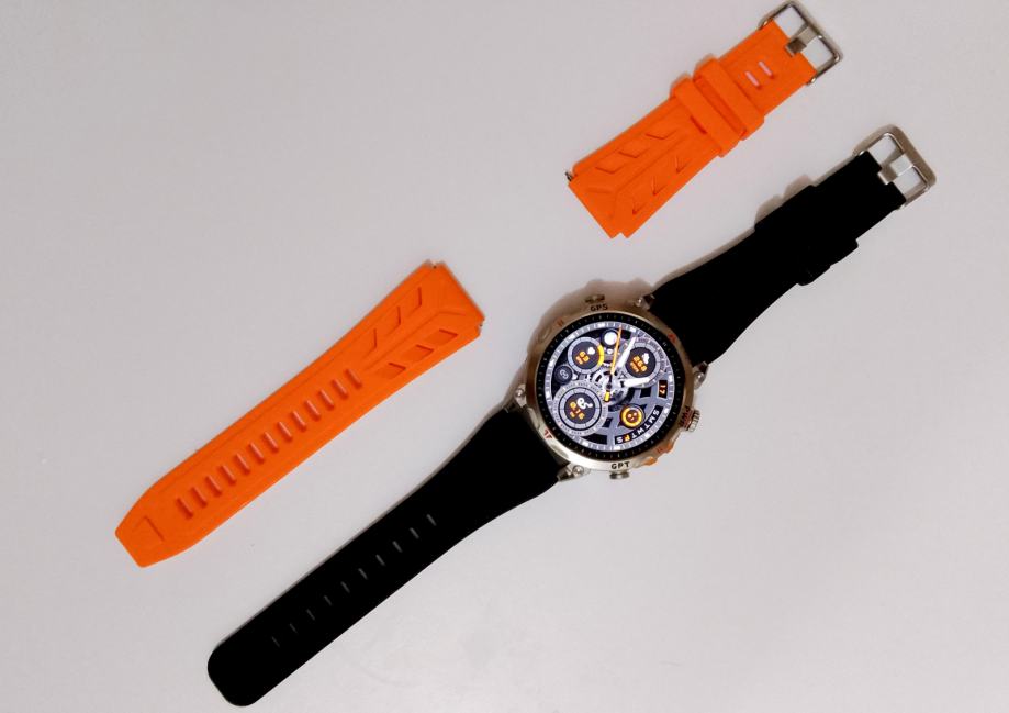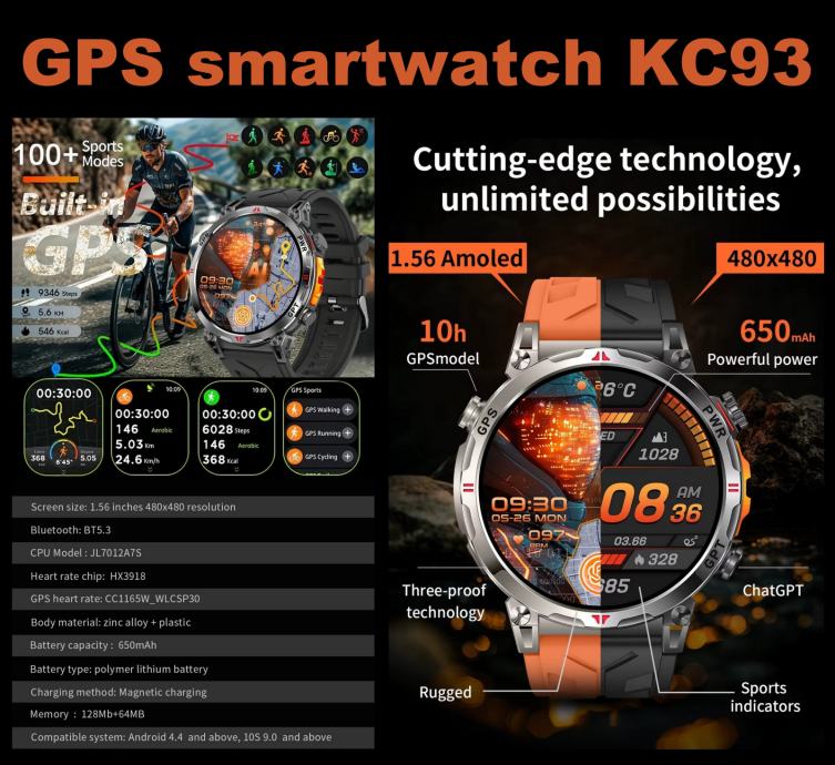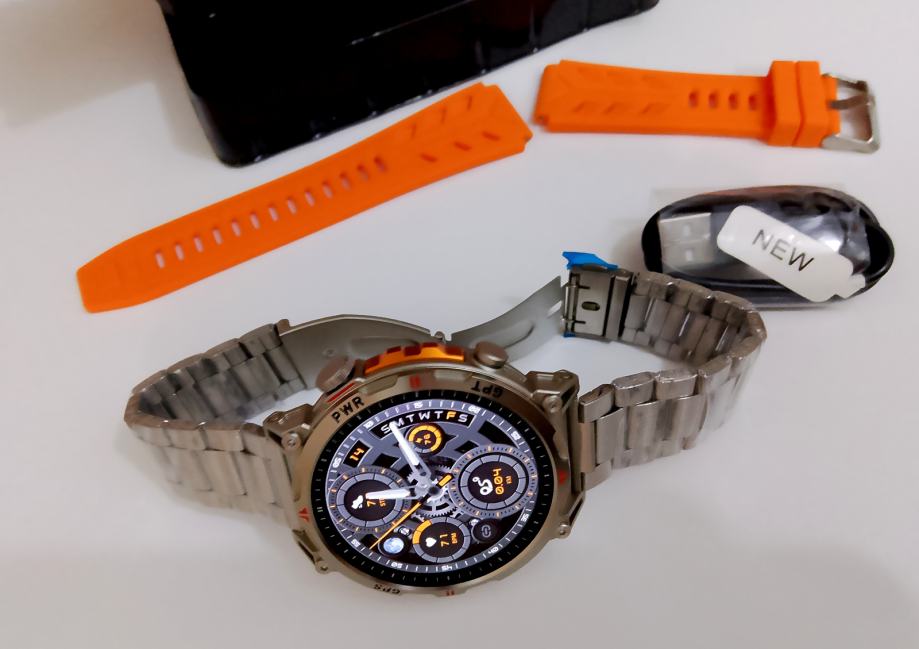 Praktično nova (samo napolnjena baterija in povezana z telefonom) , pametna ura KC93 z vgrajenim GPS senzorjem , ki dela na aplikacijo " DaFit " , preko katere se lahko poveže z aplikacijo " STRAVA " . Funkcije: Bluetooth klicanje , sprejemanje klicev in SMS-ov preko ure , obvestila z družbenih omrežij , GPS sledenje (tudi brez telefona) , štetje korakov in pokurjenih kalorij , spremlanje srčnega utripa , nasičenosti krvi z kisikom , kvalitete spanca , stres meter , ženski ciklus , AI voice , GPT (umetna inteligenca) , višinomer , barometer , kompas , flash light , alarm , timer , igre ...
