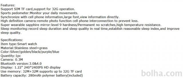 Material:nerjaveče jeklo,safirno steklo ,trdote 9H,ki prenasa visoke temperature